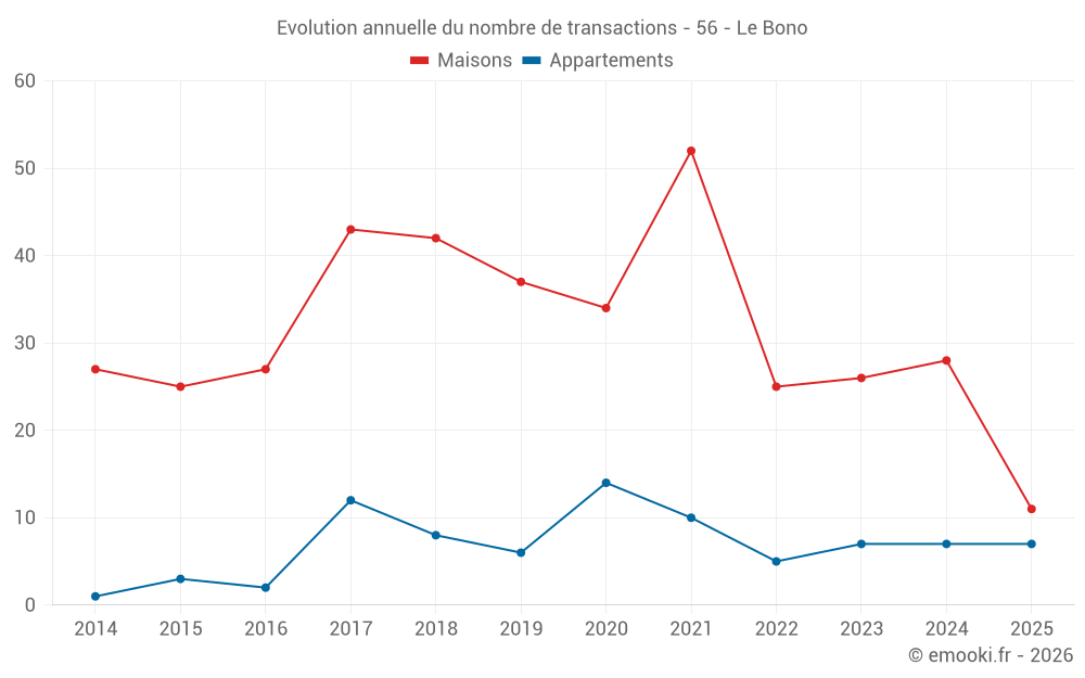 Le prix médian sur les 27 transactions de maisons des 12 derniers mois dans la commune du Bono était de 4 449 € par mètre carré pour une valeur foncière médiane de 427 000 €. Sur cette période 60% des transactions se sont situées entre 3 523 et 6 218 € par mètre carré (du 2ème au 8ème déciles).
