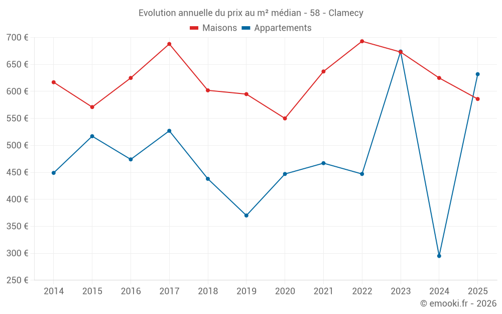 Le prix médian sur les 15 transactions d'appartements des 24 derniers mois dans la commune de Clamecy était de 632 € par mètre carré pour une valeur foncière médiane de 38 000 €. Sur cette période 60% des transactions se sont situées entre 265 et 716 € par mètre carré (du 2ème au 8ème déciles).