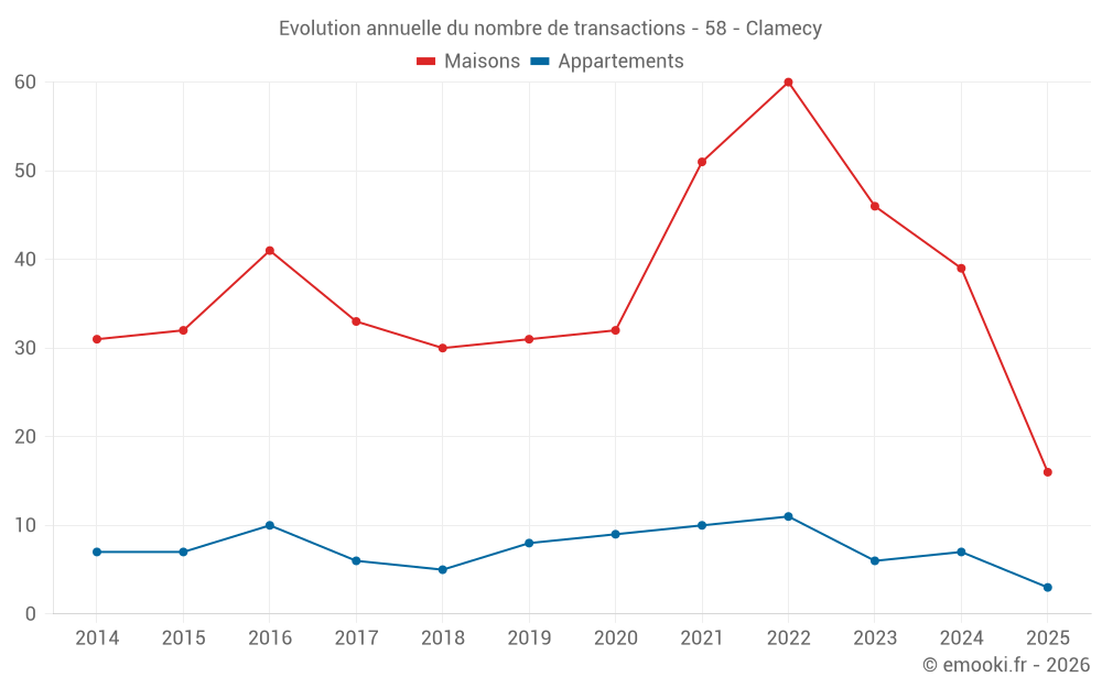 Le prix médian sur les 36 transactions de maisons des 12 derniers mois dans la commune de Clamecy était de 674 € par mètre carré pour une valeur foncière médiane de 55 250 €. Sur cette période 60% des transactions se sont situées entre 364 et 1 047 € par mètre carré (du 2ème au 8ème déciles).