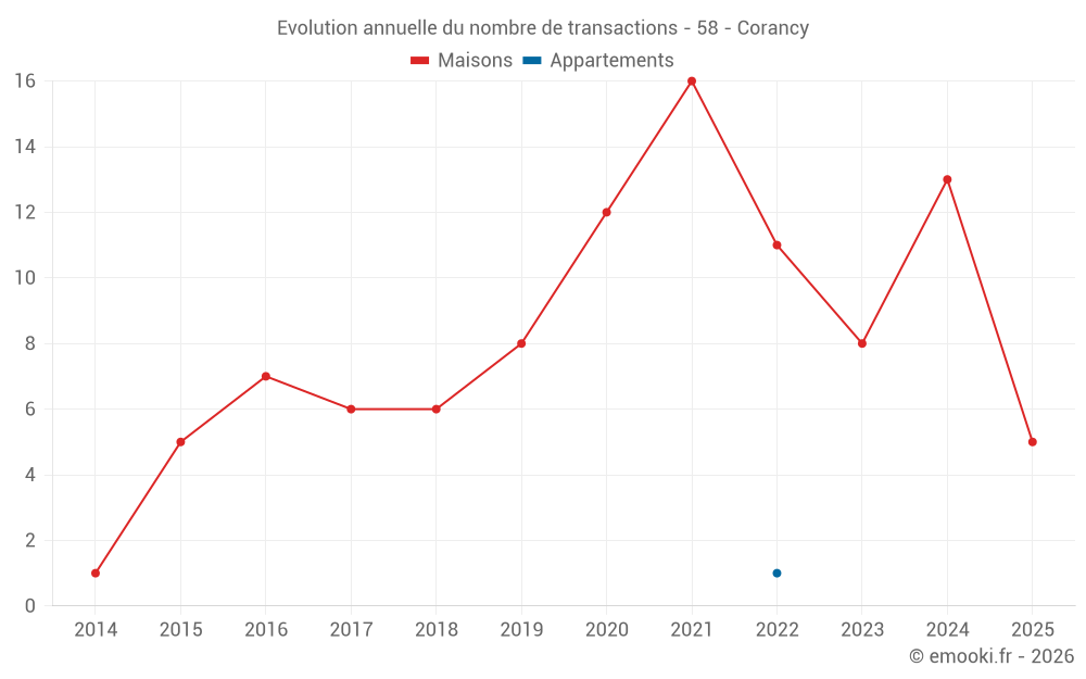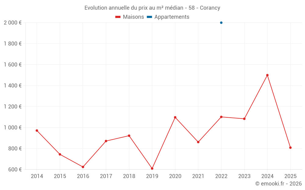 Le prix médian sur les 23 transactions de maisons des 24 derniers mois dans la commune de Corancy était de 1 250 € par mètre carré pour une valeur foncière médiane de 70 000 €. Sur cette période 60% des transactions se sont situées entre 615 et 1 697 € par mètre carré (du 2ème au 8ème déciles).