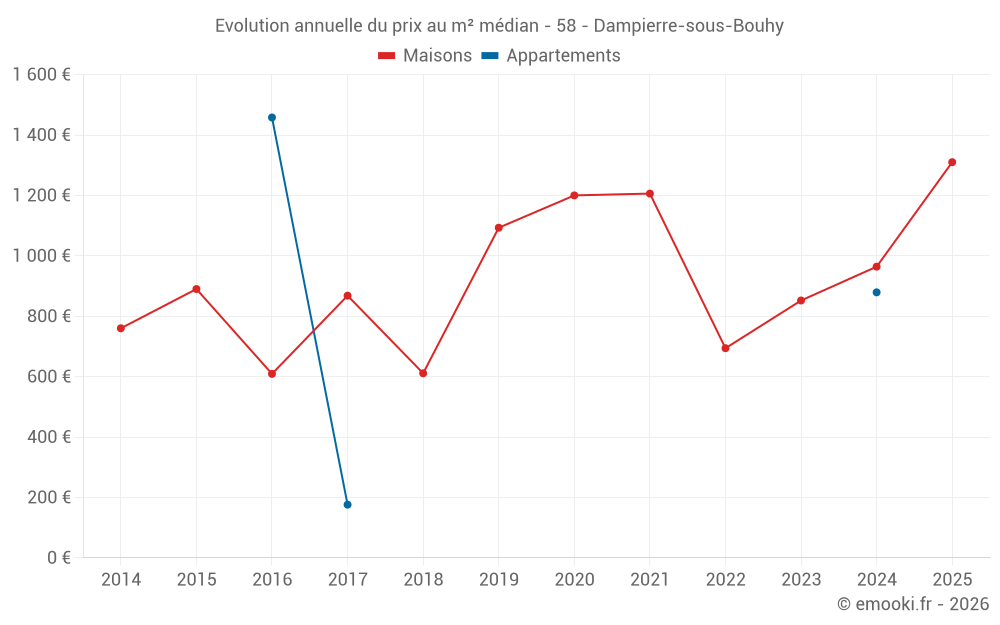 Le prix médian sur les 21 transactions de maisons des 24 derniers mois dans la commune de Dampierre-sous-Bouhy était de 1 056 € par mètre carré pour une valeur foncière médiane de 113 000 €. Sur cette période 60% des transactions se sont situées entre 569 et 1 609 € par mètre carré (du 2ème au 8ème déciles).