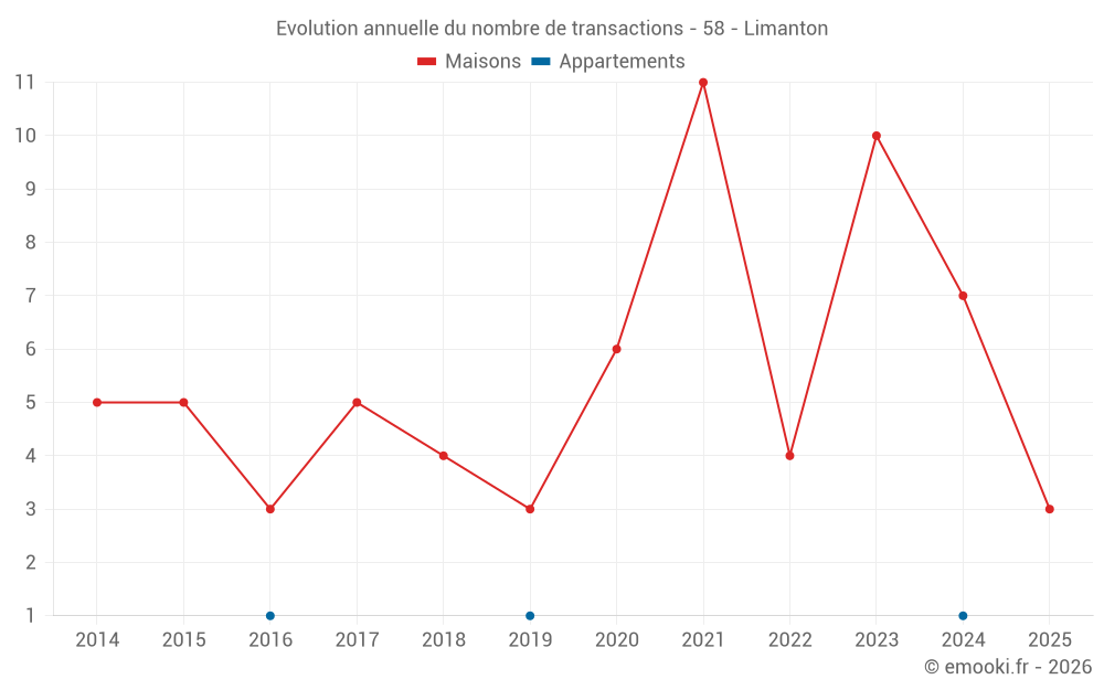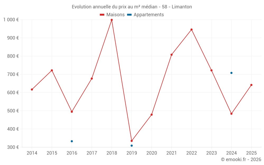 Le prix médian sur les 16 transactions de maisons des 24 derniers mois dans la commune de Limanton était de 660 € par mètre carré pour une valeur foncière médiane de 43 700 €. Sur cette période 60% des transactions se sont situées entre 333 et 821 € par mètre carré (du 2ème au 8ème déciles).