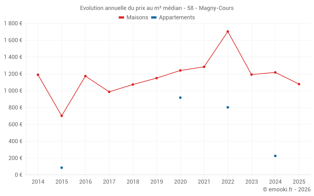 Le prix médian sur les 19 transactions de maisons des 12 derniers mois dans la commune de Magny-Cours était de 1 048 € par mètre carré pour une valeur foncière médiane de 88 000 €. Sur cette période 60% des transactions se sont situées entre 517 et 1 335 € par mètre carré (du 2ème au 8ème déciles).