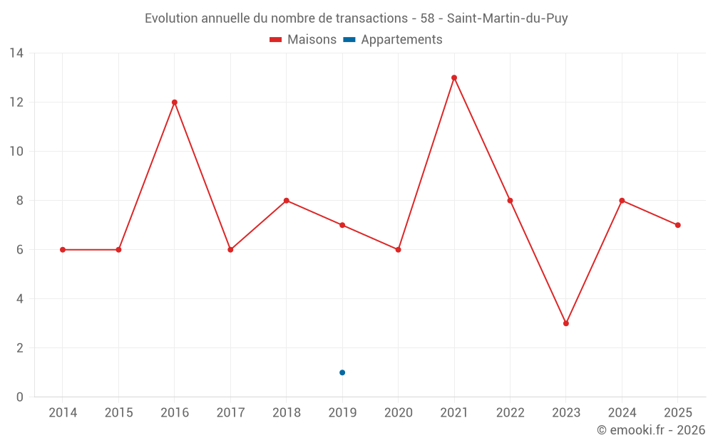 Le prix médian sur les 17 transactions de maisons des 24 derniers mois dans la commune de Saint-Martin-du-Puy était de 727 € par mètre carré pour une valeur foncière médiane de 65 000 €. Sur cette période 60% des transactions se sont situées entre 584 et 1 282 € par mètre carré (du 2ème au 8ème déciles).