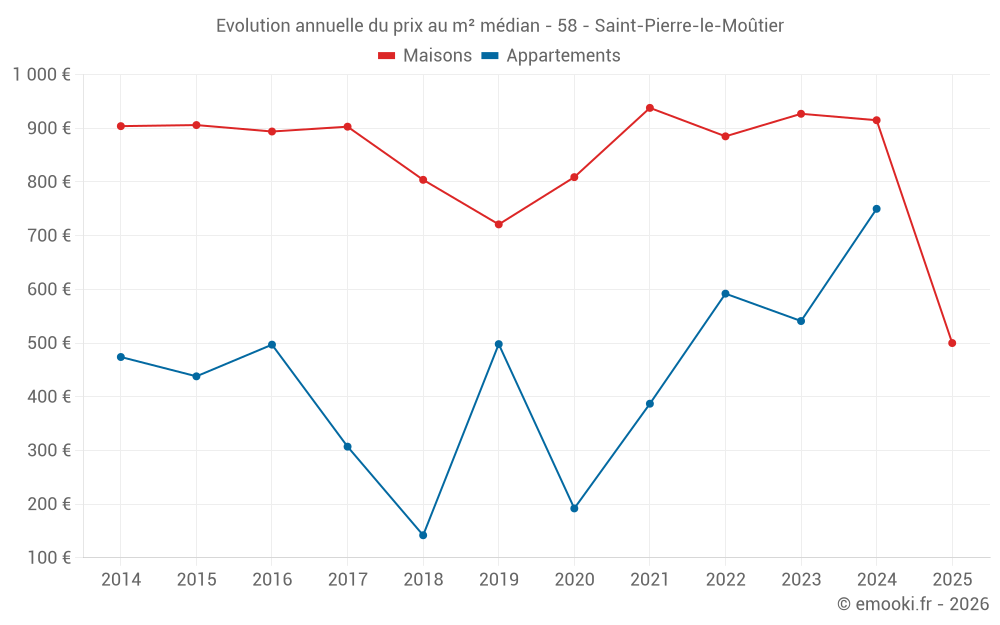 Le prix médian sur les 21 transactions de maisons des 12 derniers mois dans la commune de Saint-Pierre-le-Moûtier était de 857 € par mètre carré pour une valeur foncière médiane de 55 000 €. Sur cette période 60% des transactions se sont situées entre 440 et 1 382 € par mètre carré (du 2ème au 8ème déciles).