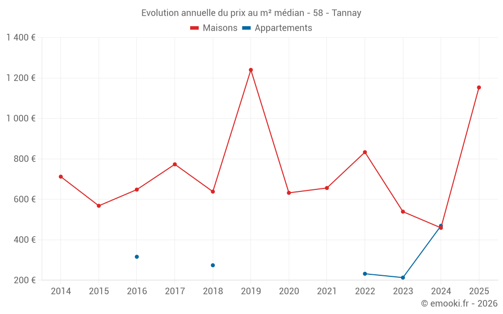 Le prix médian sur les 22 transactions de maisons des 24 derniers mois dans la commune de Tannay était de 474 € par mètre carré pour une valeur foncière médiane de 46 500 €. Sur cette période 60% des transactions se sont situées entre 339 et 795 € par mètre carré (du 2ème au 8ème déciles).