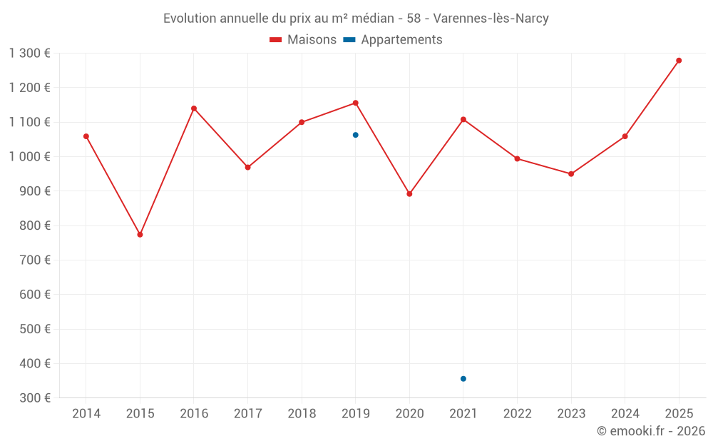 Le prix médian sur les 24 transactions de maisons des 24 derniers mois dans la commune de Varennes-lès-Narcy était de 1 085 € par mètre carré pour une valeur foncière médiane de 93 400 €. Sur cette période 60% des transactions se sont situées entre 669 et 1 561 € par mètre carré (du 2ème au 8ème déciles).