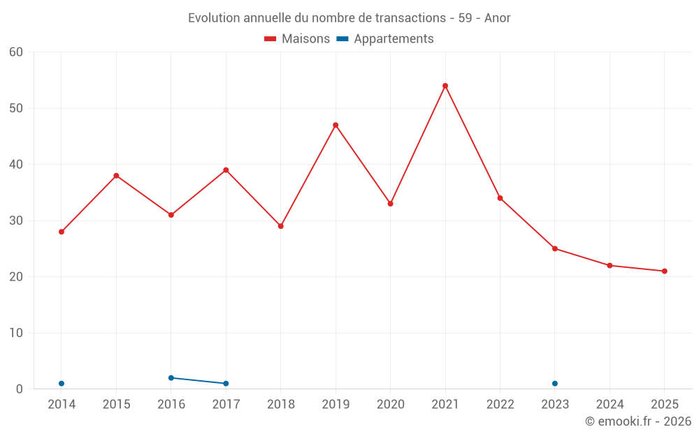 Le prix médian sur les 21 transactions de maisons des 6 derniers mois dans la commune d'Anor était de 1 482 € par mètre carré pour une valeur foncière médiane de 139 500 €. Sur cette période 60% des transactions se sont situées entre 500 et 1 705 € par mètre carré (du 2ème au 8ème déciles).
