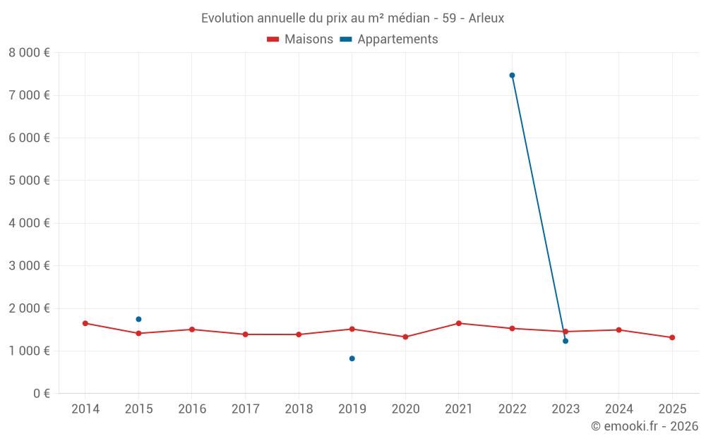 Le prix médian sur les 36 transactions de maisons des 12 derniers mois dans la commune d'Arleux était de 1 347 € par mètre carré pour une valeur foncière médiane de 122 975 €. Sur cette période 60% des transactions se sont situées entre 980 et 1 714 € par mètre carré (du 2ème au 8ème déciles).