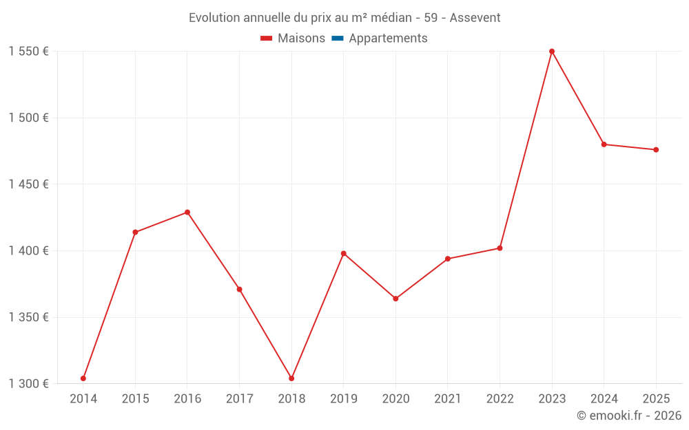 Le prix médian sur les 17 transactions de maisons des 12 derniers mois dans la commune d'Assevent était de 1 476 € par mètre carré pour une valeur foncière médiane de 140 000 €. Sur cette période 60% des transactions se sont situées entre 1 086 et 2 014 € par mètre carré (du 2ème au 8ème déciles).