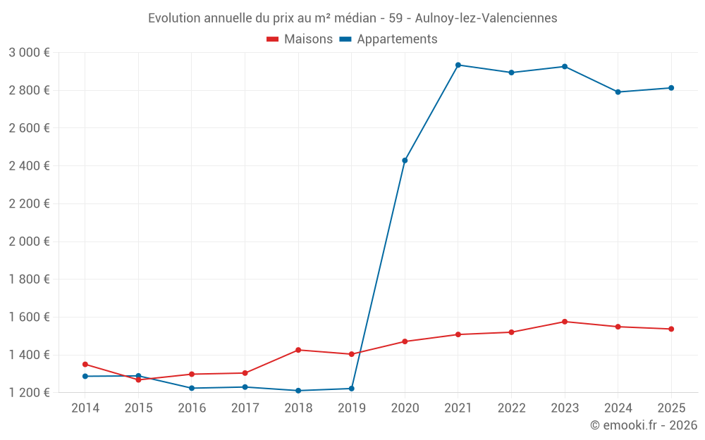 Le prix médian sur les 27 transactions d'appartements des 24 derniers mois dans la commune d'Aulnoy-lez-Valenciennes était de 2 806 € par mètre carré pour une valeur foncière médiane de 55 652 €. Sur cette période 60% des transactions se sont situées entre 2 560 et 2 980 € par mètre carré (du 2ème au 8ème déciles).