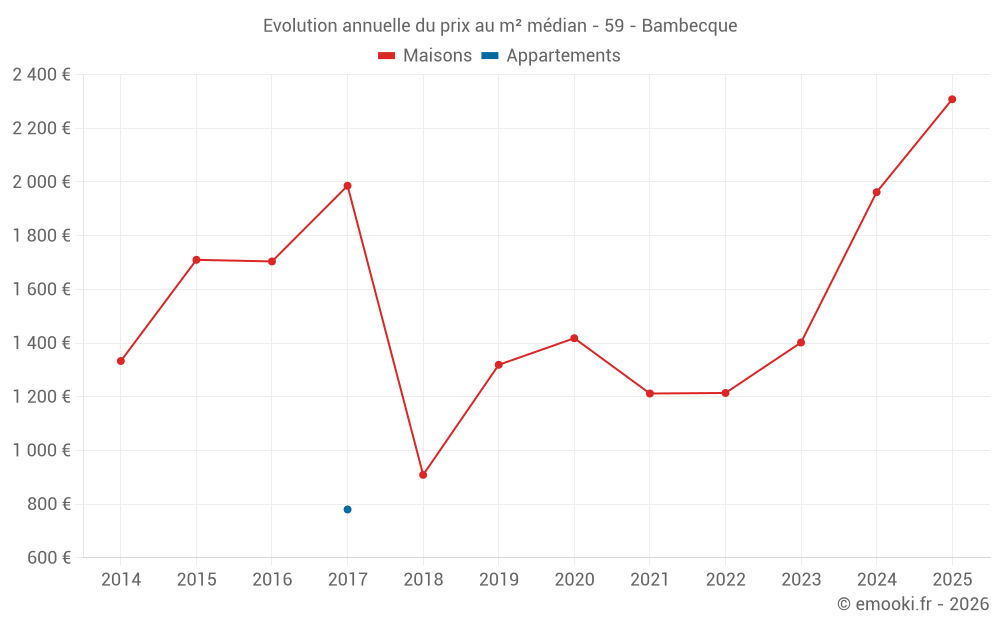Le prix médian sur les 20 transactions de maisons des 24 derniers mois dans la commune de Bambecque était de 1 768 € par mètre carré pour une valeur foncière médiane de 193 425 €. Sur cette période 60% des transactions se sont situées entre 1 214 et 2 317 € par mètre carré (du 2ème au 8ème déciles).