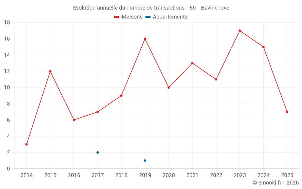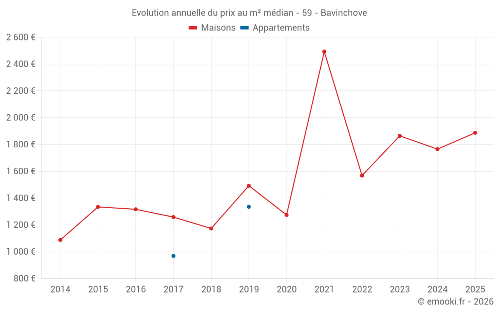 Le prix médian sur les 29 transactions de maisons des 24 derniers mois dans la commune de Bavinchove était de 1 765 € par mètre carré pour une valeur foncière médiane de 170 000 €. Sur cette période 60% des transactions se sont situées entre 1 393 et 2 298 € par mètre carré (du 2ème au 8ème déciles).