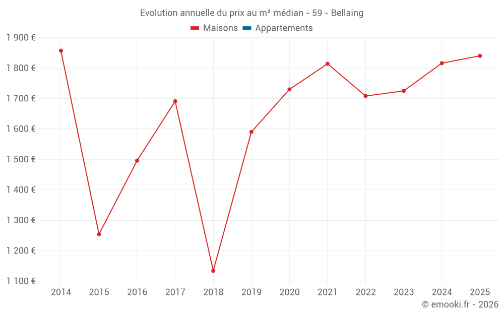 Le prix médian sur les 20 transactions de maisons des 24 derniers mois dans la commune de Bellaing était de 1 742 € par mètre carré pour une valeur foncière médiane de 158 501 €. Sur cette période 60% des transactions se sont situées entre 1 427 et 2 096 € par mètre carré (du 2ème au 8ème déciles).