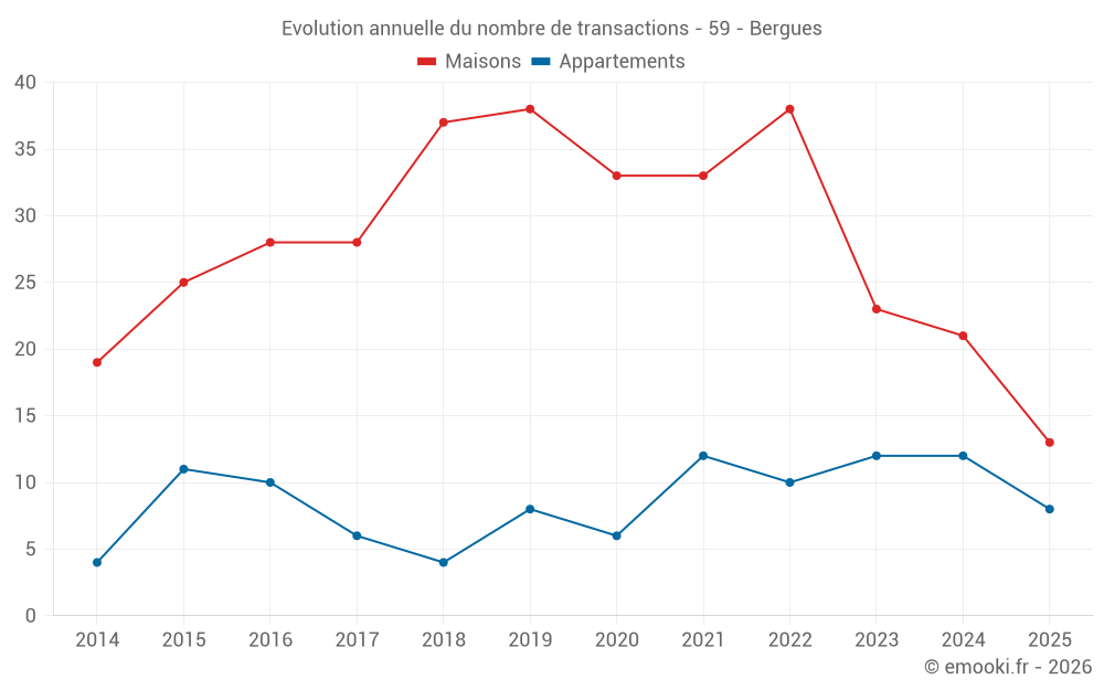 Le prix médian sur les 26 transactions de maisons des 12 derniers mois dans la commune de Bergues était de 2 013 € par mètre carré pour une valeur foncière médiane de 163 925 €. Sur cette période 60% des transactions se sont situées entre 1 386 et 2 750 € par mètre carré (du 2ème au 8ème déciles).
