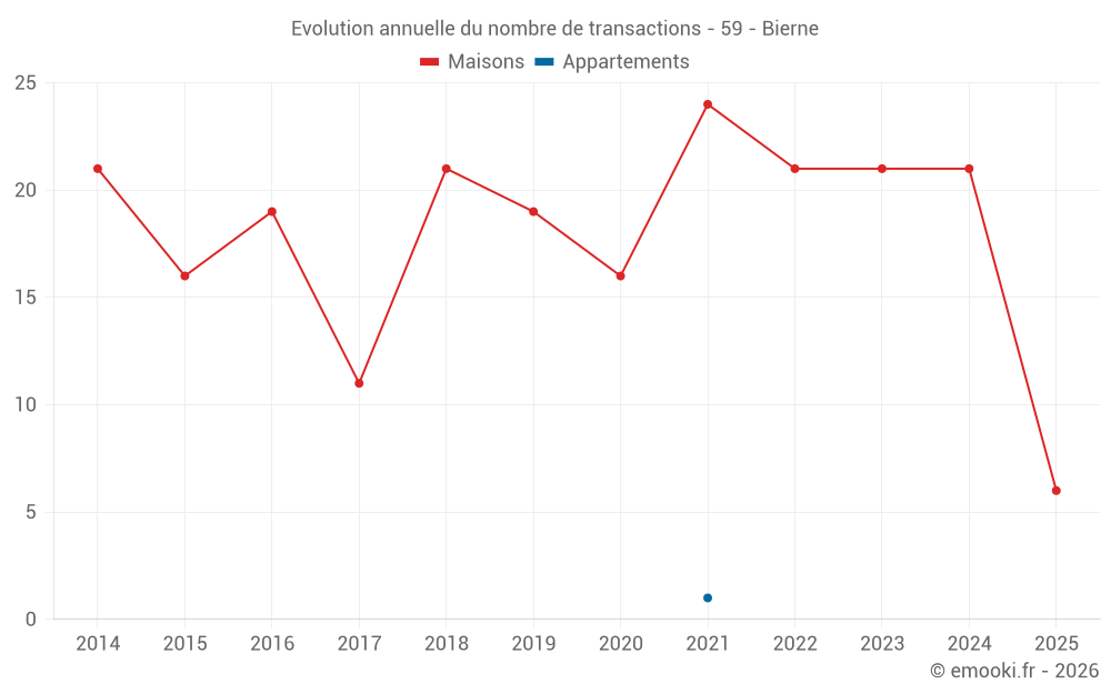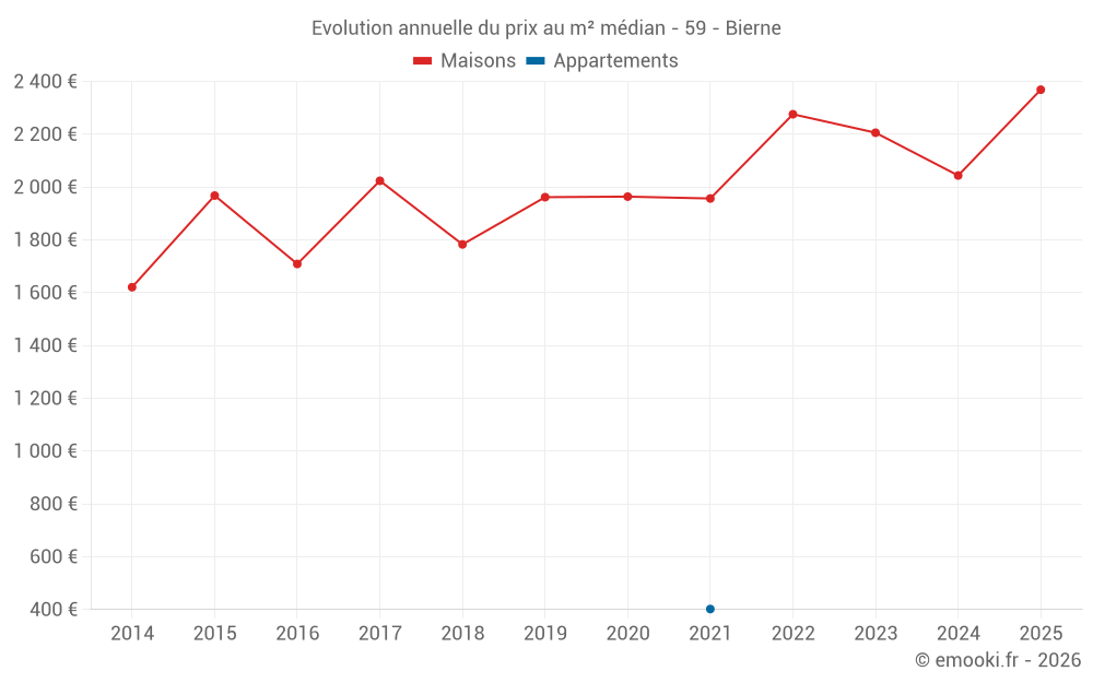 Le prix médian sur les 20 transactions de maisons des 12 derniers mois dans la commune de Bierne était de 2 124 € par mètre carré pour une valeur foncière médiane de 227 500 €. Sur cette période 60% des transactions se sont situées entre 1 858 et 2 481 € par mètre carré (du 2ème au 8ème déciles).