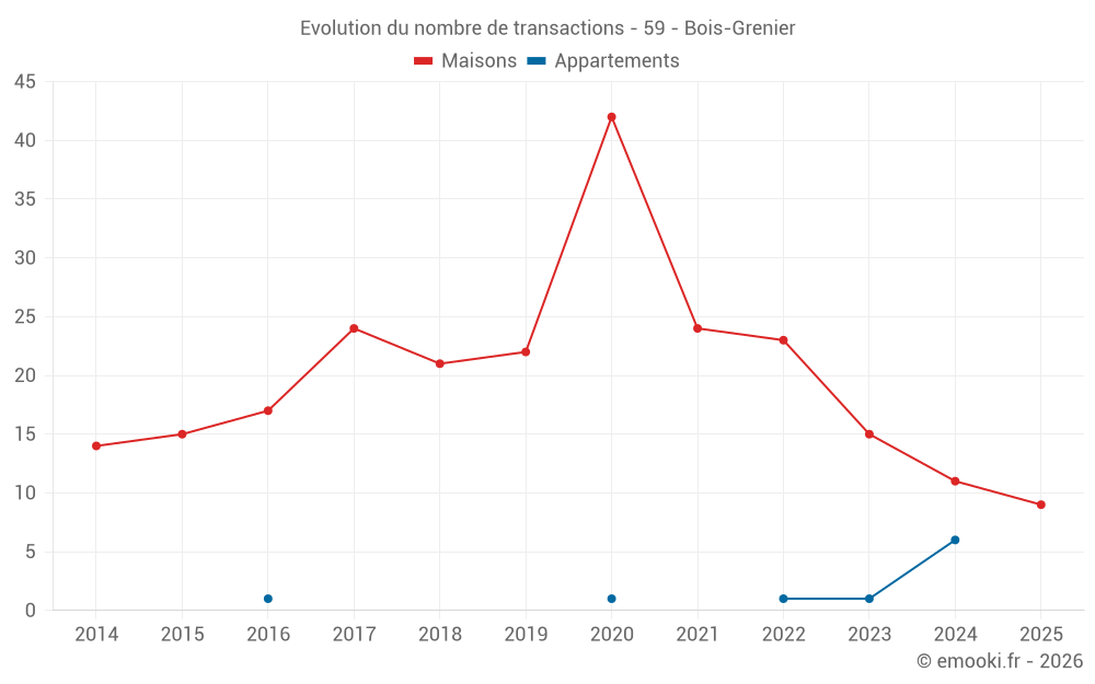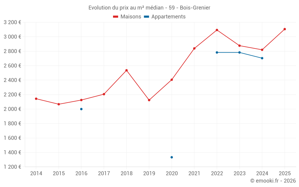 Le prix médian sur les 16 transactions de maisons des 12 derniers mois dans la commune de Bois-Grenier était de 3 098 € par mètre carré pour une valeur foncière médiane de 269 000 €. Sur cette période 60% des transactions se sont situées entre 2 442 et 3 342 € par mètre carré (du 2ème au 8ème déciles).