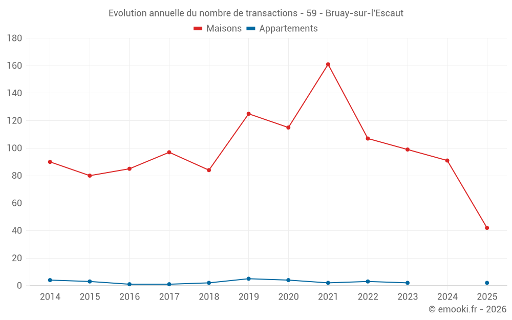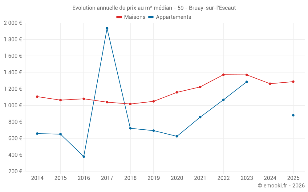 Le prix médian sur les 42 transactions de maisons des 6 derniers mois dans la commune de Bruay-sur-l'Escaut était de 1 288 € par mètre carré pour une valeur foncière médiane de 123 400 €. Sur cette période 60% des transactions se sont situées entre 953 et 1 677 € par mètre carré (du 2ème au 8ème déciles).