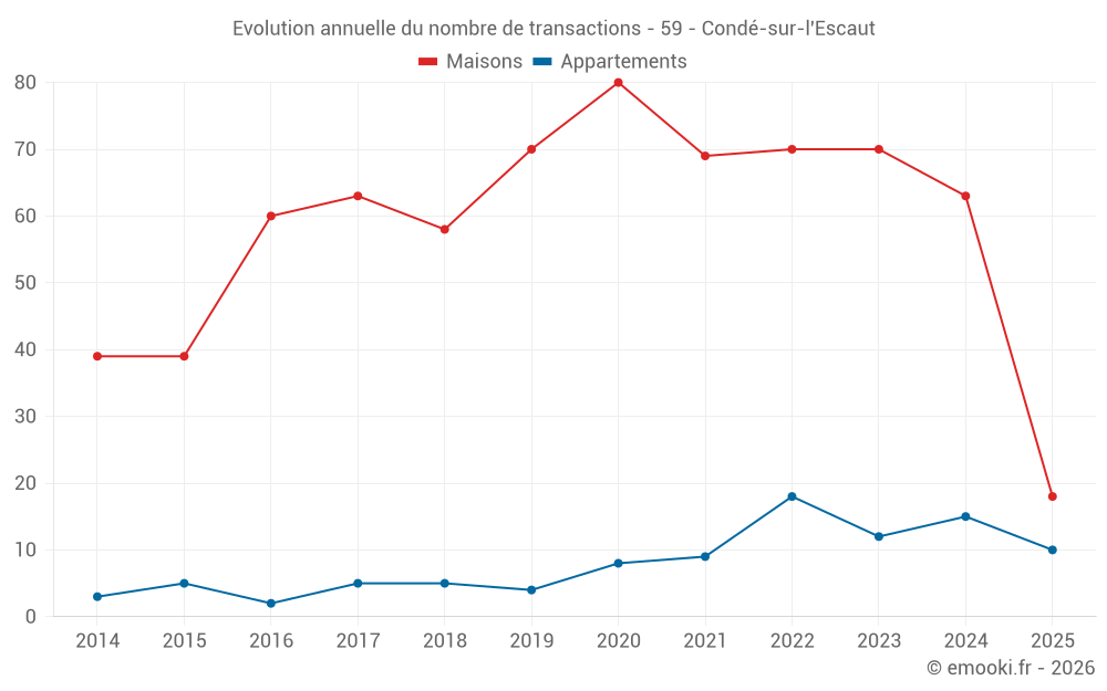 Le prix médian sur les 18 transactions d'appartements des 12 derniers mois dans la commune de Condé-sur-l'Escaut était de 1 280 € par mètre carré pour une valeur foncière médiane de 65 000 €. Sur cette période 60% des transactions se sont situées entre 1 211 et 1 392 € par mètre carré (du 2ème au 8ème déciles).