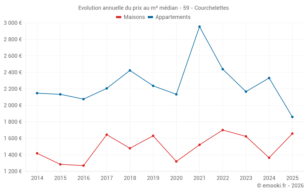 Le prix médian sur les 23 transactions de maisons des 12 derniers mois dans la commune de Courchelettes était de 1 568 € par mètre carré pour une valeur foncière médiane de 160 400 €. Sur cette période 60% des transactions se sont situées entre 1 107 et 2 048 € par mètre carré (du 2ème au 8ème déciles).