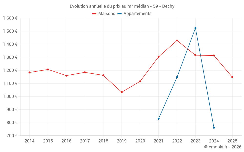 Le prix médian sur les 19 transactions de maisons des 6 derniers mois dans la commune de Dechy était de 1 148 € par mètre carré pour une valeur foncière médiane de 100 000 €. Sur cette période 60% des transactions se sont situées entre 927 et 1 532 € par mètre carré (du 2ème au 8ème déciles).