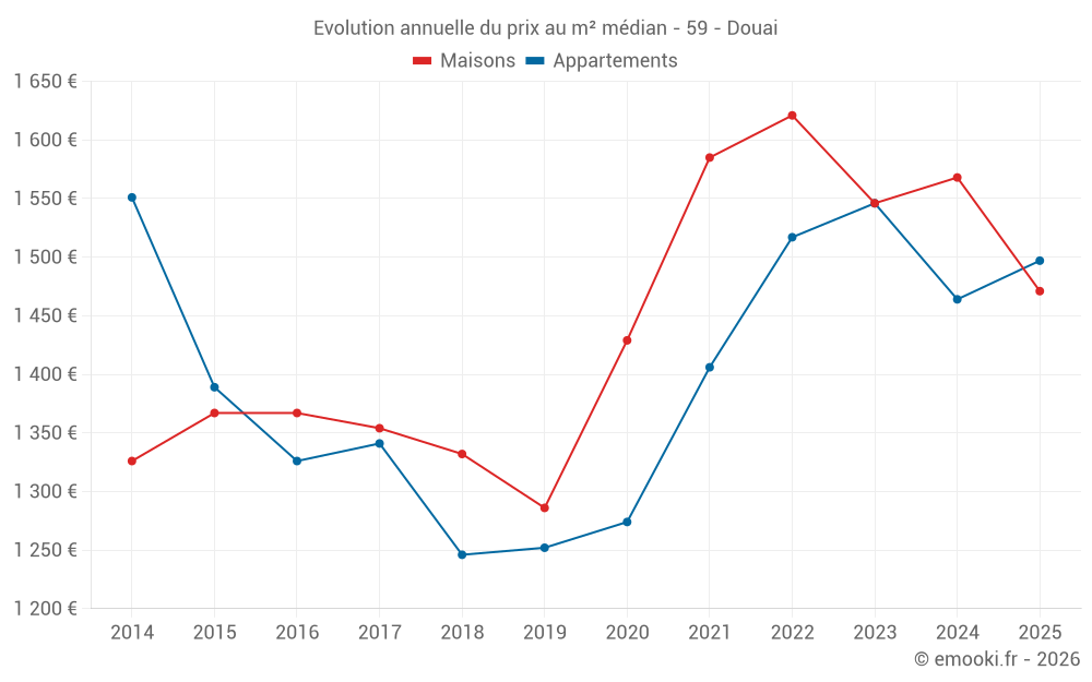 Le prix médian sur les 42 transactions d'appartements des 3 derniers mois dans la commune de Douai était de 1 396 € par mètre carré pour une valeur foncière médiane de 79 750 €. Sur cette période 60% des transactions se sont situées entre 1 181 et 2 083 € par mètre carré (du 2ème au 8ème déciles).