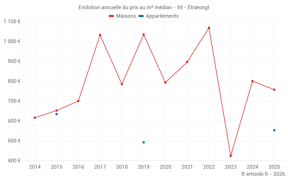 Le prix médian sur les 16 transactions de maisons des 12 derniers mois dans la commune d'Étrœungt était de 758 € par mètre carré pour une valeur foncière médiane de 82 250 €. Sur cette période 60% des transactions se sont situées entre 535 et 979 € par mètre carré (du 2ème au 8ème déciles).