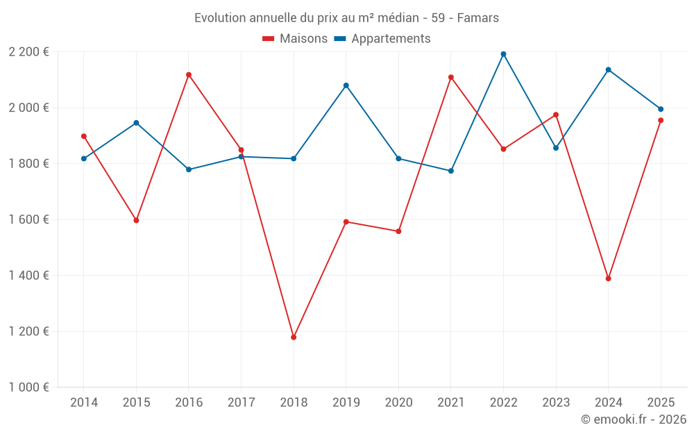Le prix médian sur les 26 transactions d'appartements des 24 derniers mois dans la commune de Famars était de 1 995 € par mètre carré pour une valeur foncière médiane de 57 400 €. Sur cette période 60% des transactions se sont situées entre 1 828 et 2 236 € par mètre carré (du 2ème au 8ème déciles).