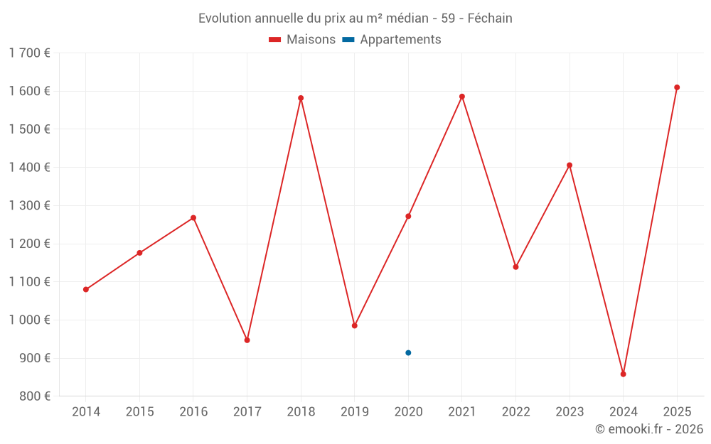 Le prix médian sur les 22 transactions de maisons des 12 derniers mois dans la commune de Féchain était de 1 319 € par mètre carré pour une valeur foncière médiane de 126 000 €. Sur cette période 60% des transactions se sont situées entre 809 et 1 833 € par mètre carré (du 2ème au 8ème déciles).