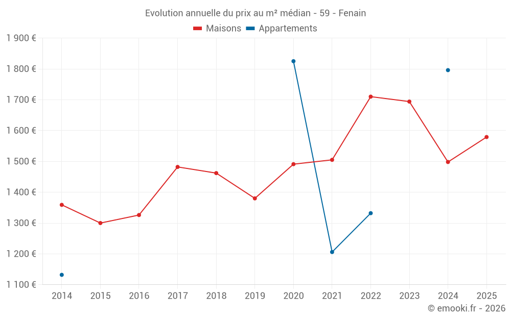 Le prix médian sur les 24 transactions de maisons des 6 derniers mois dans la commune de Fenain était de 1 579 € par mètre carré pour une valeur foncière médiane de 152 600 €. Sur cette période 60% des transactions se sont situées entre 1 163 et 1 938 € par mètre carré (du 2ème au 8ème déciles).