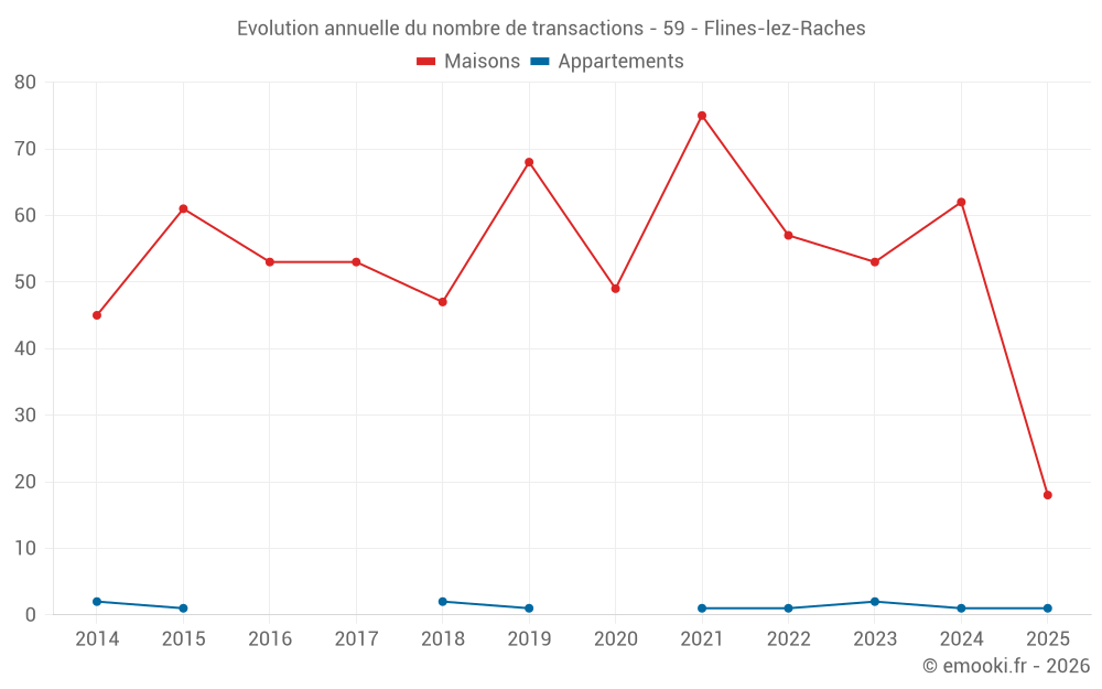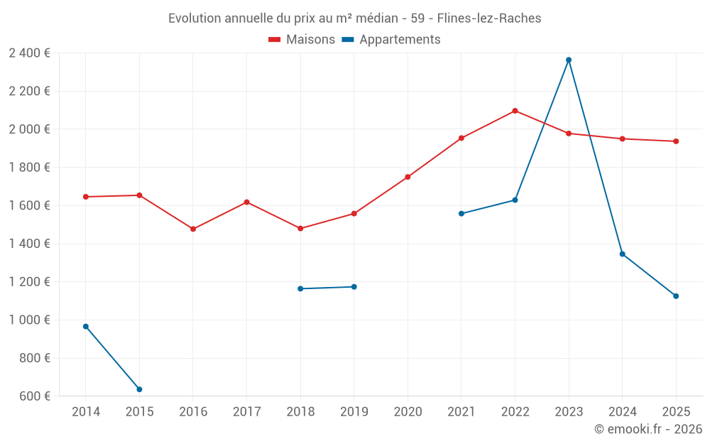 Le prix médian sur les 18 transactions de maisons des 6 derniers mois dans la commune de Flines-lez-Raches était de 1 937 € par mètre carré pour une valeur foncière médiane de 150 000 €. Sur cette période 60% des transactions se sont situées entre 1 472 et 2 405 € par mètre carré (du 2ème au 8ème déciles).