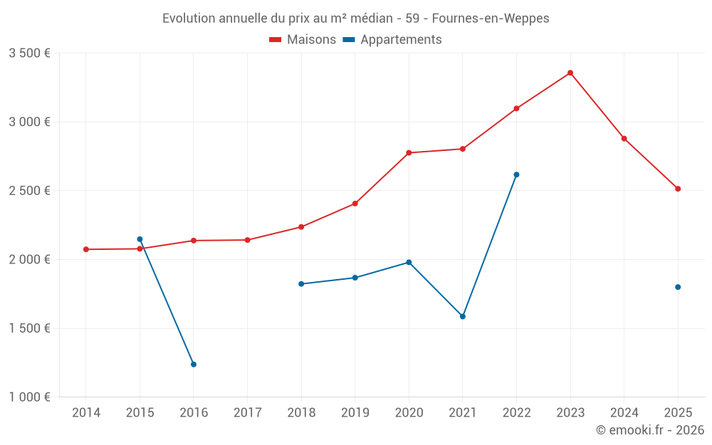 Le prix médian sur les 31 transactions de maisons des 12 derniers mois dans la commune de Fournes-en-Weppes était de 2 686 € par mètre carré pour une valeur foncière médiane de 260 080 €. Sur cette période 60% des transactions se sont situées entre 1 654 et 3 367 € par mètre carré (du 2ème au 8ème déciles).