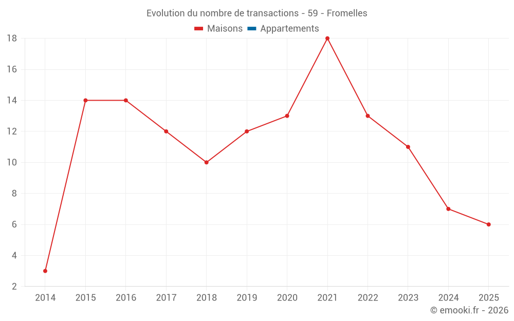 Le prix médian sur les 21 transactions de maisons des 24 derniers mois dans la commune de Fromelles était de 3 000 € par mètre carré pour une valeur foncière médiane de 340 650 €. Sur cette période 60% des transactions se sont situées entre 2 350 et 3 559 € par mètre carré (du 2ème au 8ème déciles).