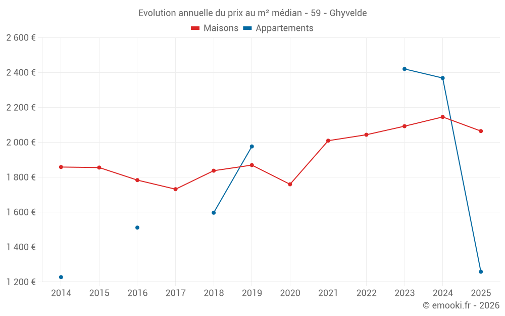 Le prix médian sur les 33 transactions de maisons des 12 derniers mois dans la commune de Ghyvelde était de 2 111 € par mètre carré pour une valeur foncière médiane de 215 000 €. Sur cette période 60% des transactions se sont situées entre 1 634 et 2 793 € par mètre carré (du 2ème au 8ème déciles).