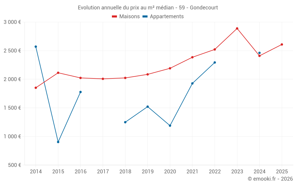 Le prix médian sur les 36 transactions de maisons des 12 derniers mois dans la commune de Gondecourt était de 2 500 € par mètre carré pour une valeur foncière médiane de 236 460 €. Sur cette période 60% des transactions se sont situées entre 1 719 et 2 914 € par mètre carré (du 2ème au 8ème déciles).