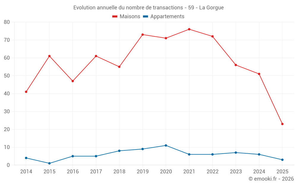 Le prix médian sur les 23 transactions de maisons des 6 derniers mois dans la commune de la Gorgue était de 1 800 € par mètre carré pour une valeur foncière médiane de 150 000 €. Sur cette période 60% des transactions se sont situées entre 1 252 et 2 168 € par mètre carré (du 2ème au 8ème déciles).