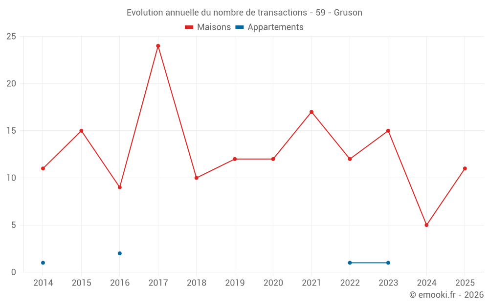 Le prix médian sur les 22 transactions de maisons des 24 derniers mois dans la commune de Gruson était de 3 687 € par mètre carré pour une valeur foncière médiane de 406 625 €. Sur cette période 60% des transactions se sont situées entre 3 314 et 4 736 € par mètre carré (du 2ème au 8ème déciles).