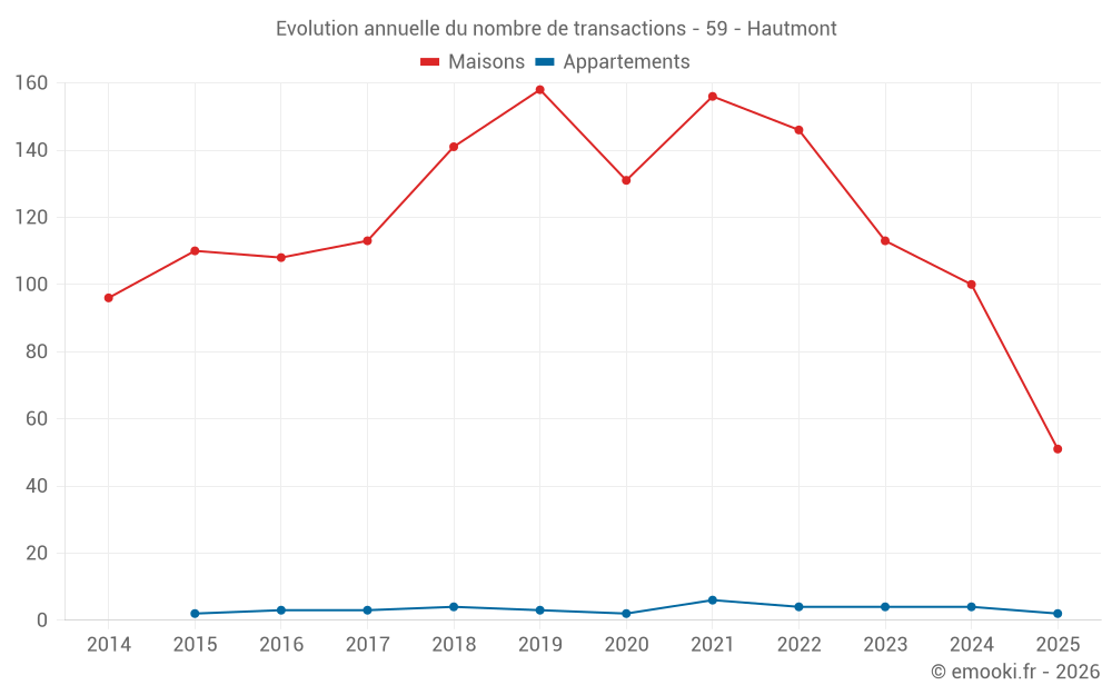 Le prix médian sur les 25 transactions de maisons des 3 derniers mois dans la commune d'Hautmont était de 1 034 € par mètre carré pour une valeur foncière médiane de 88 000 €. Sur cette période 60% des transactions se sont situées entre 553 et 1 707 € par mètre carré (du 2ème au 8ème déciles).