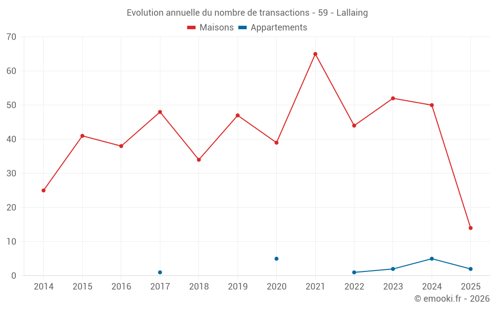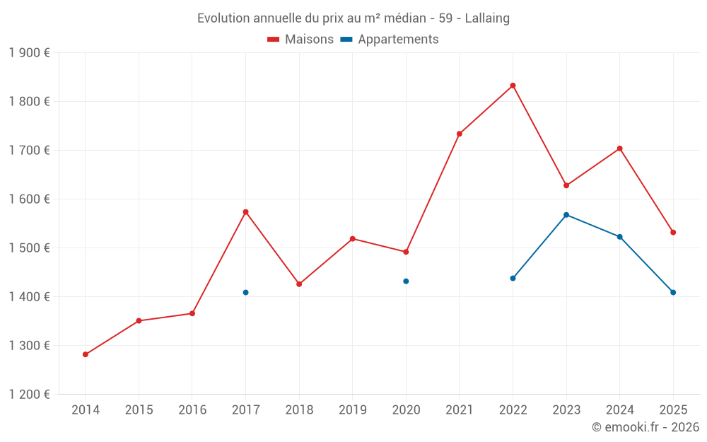 Le prix médian sur les 43 transactions de maisons des 12 derniers mois dans la commune de Lallaing était de 1 520 € par mètre carré pour une valeur foncière médiane de 158 700 €. Sur cette période 60% des transactions se sont situées entre 1 110 et 1 949 € par mètre carré (du 2ème au 8ème déciles).