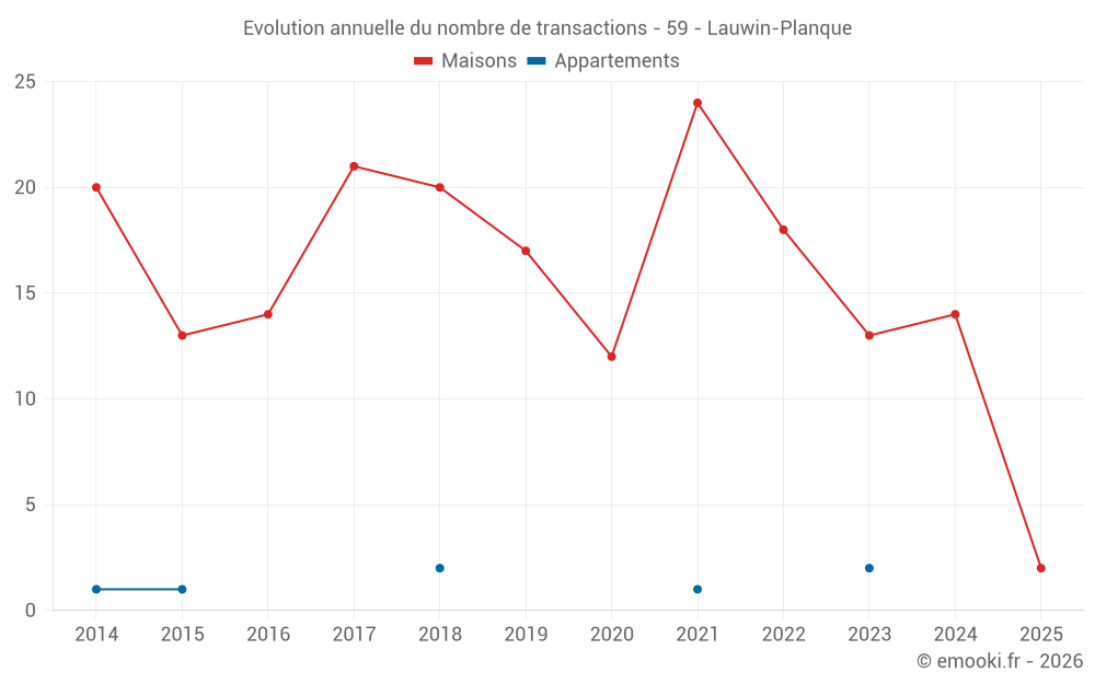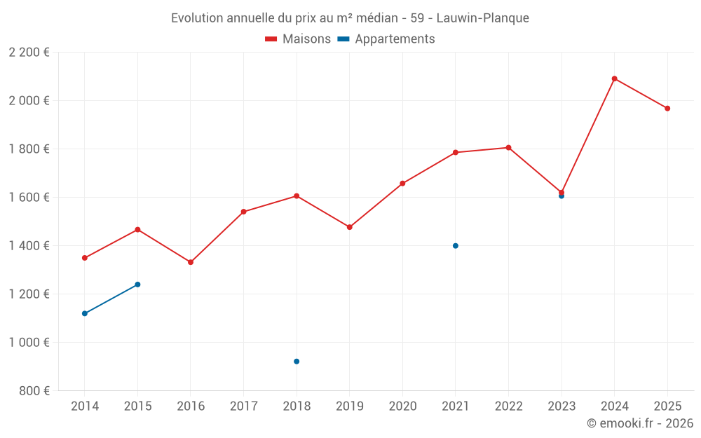 Le prix médian sur les 24 transactions de maisons des 24 derniers mois dans la commune de Lauwin-Planque était de 1 916 € par mètre carré pour une valeur foncière médiane de 169 125 €. Sur cette période 60% des transactions se sont situées entre 1 448 et 2 224 € par mètre carré (du 2ème au 8ème déciles).
