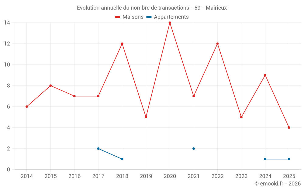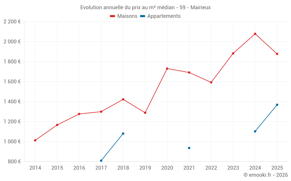 Le prix médian sur les 15 transactions de maisons des 24 derniers mois dans la commune de Mairieux était de 1 882 € par mètre carré pour une valeur foncière médiane de 206 000 €. Sur cette période 60% des transactions se sont situées entre 1 610 et 2 330 € par mètre carré (du 2ème au 8ème déciles).