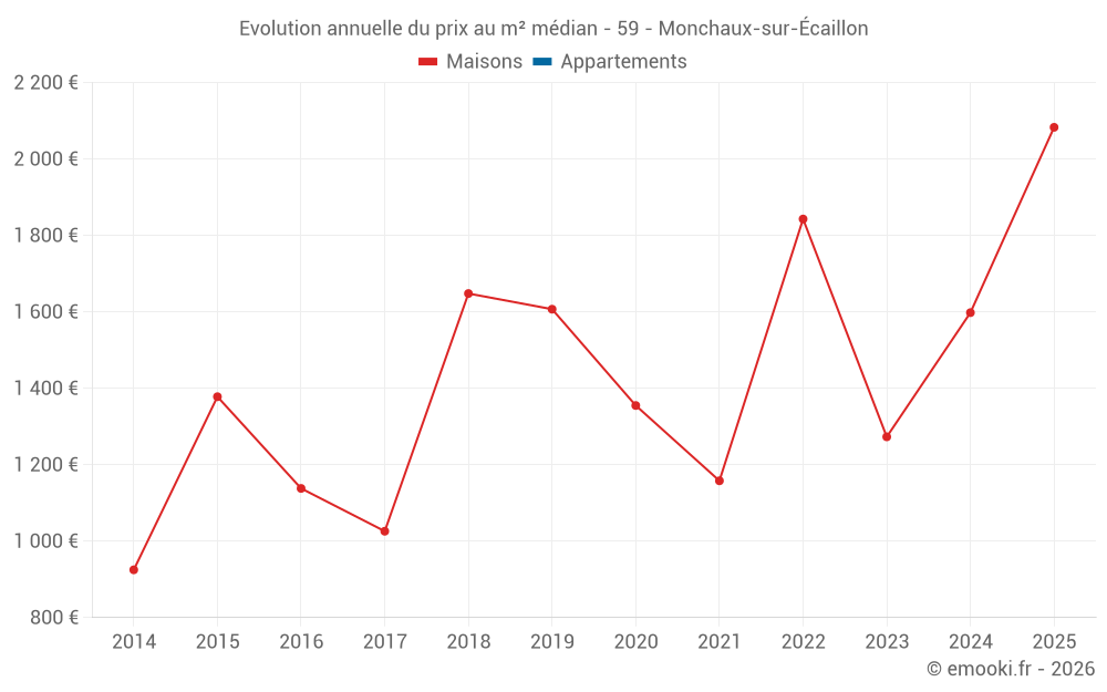 Le prix médian sur les 19 transactions de maisons des 24 derniers mois dans la commune de Monchaux-sur-Écaillon était de 1 576 € par mètre carré pour une valeur foncière médiane de 130 000 €. Sur cette période 60% des transactions se sont situées entre 802 et 2 263 € par mètre carré (du 2ème au 8ème déciles).