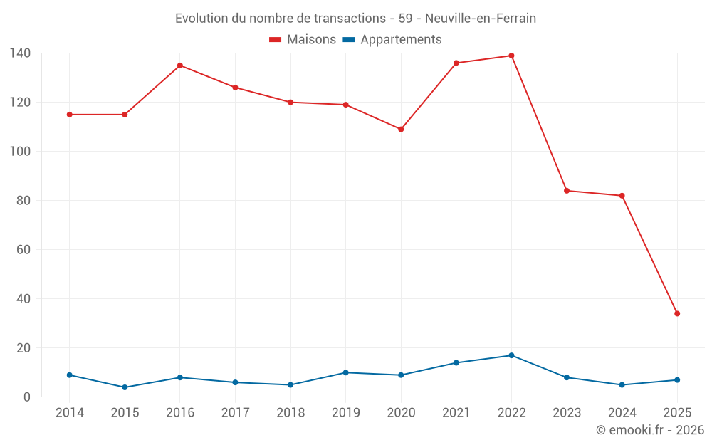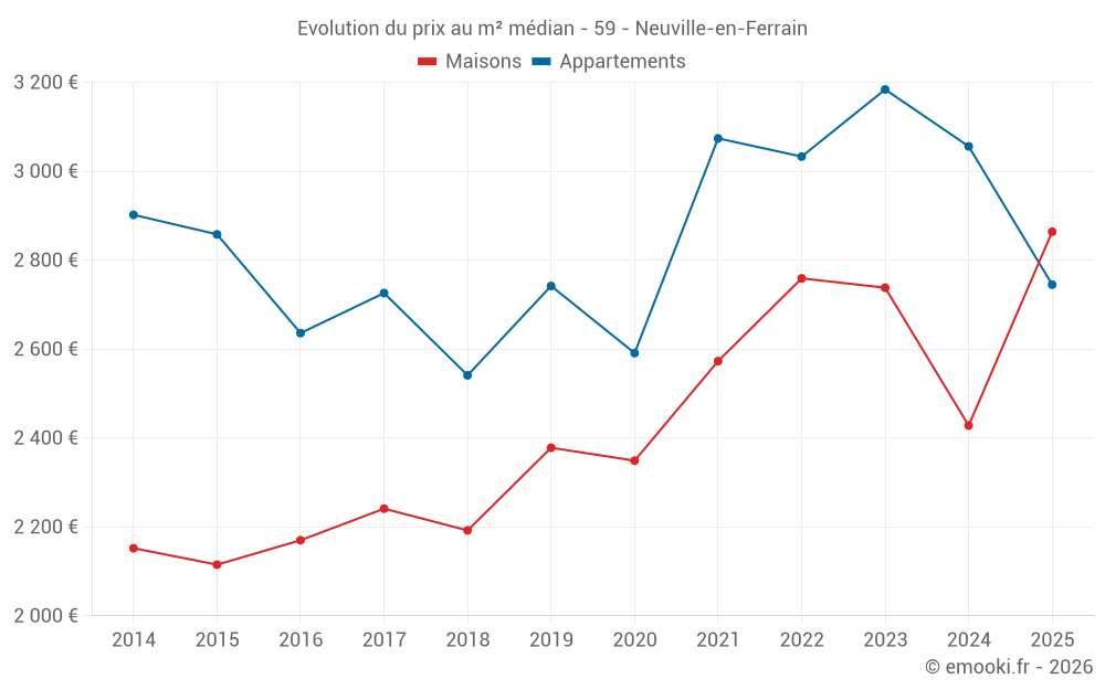 Le prix médian sur les 34 transactions de maisons des 6 derniers mois dans la commune de Neuville-en-Ferrain était de 2 864 € par mètre carré pour une valeur foncière médiane de 247 145 €. Sur cette période 60% des transactions se sont situées entre 2 075 et 3 221 € par mètre carré (du 2ème au 8ème déciles).