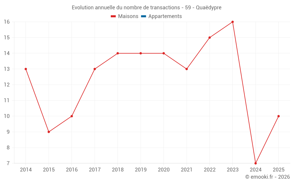 Le prix médian sur les 29 transactions de maisons des 24 derniers mois dans la commune de Quaëdypre était de 1 959 € par mètre carré pour une valeur foncière médiane de 200 000 €. Sur cette période 60% des transactions se sont situées entre 1 538 et 2 443 € par mètre carré (du 2ème au 8ème déciles).