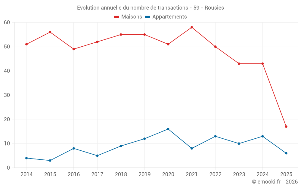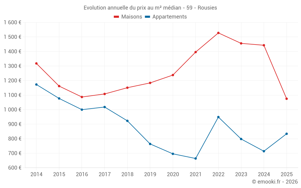 Le prix médian sur les 42 transactions de maisons des 12 derniers mois dans la commune de Rousies était de 1 306 € par mètre carré pour une valeur foncière médiane de 114 850 €. Sur cette période 60% des transactions se sont situées entre 789 et 1 787 € par mètre carré (du 2ème au 8ème déciles).