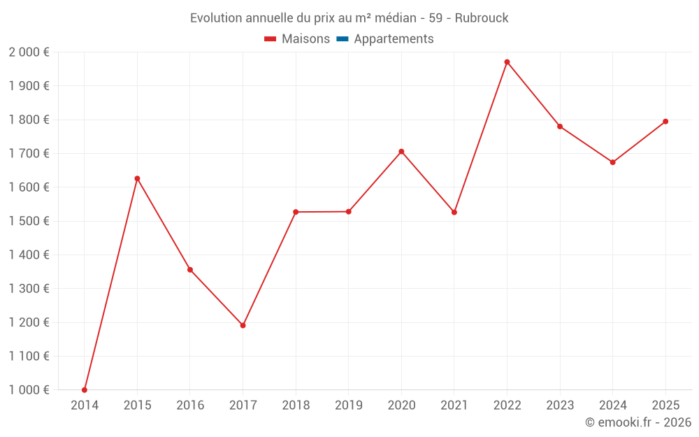Le prix médian sur les 17 transactions de maisons des 24 derniers mois dans la commune de Rubrouck était de 1 808 € par mètre carré pour une valeur foncière médiane de 183 000 €. Sur cette période 60% des transactions se sont situées entre 1 161 et 2 621 € par mètre carré (du 2ème au 8ème déciles).