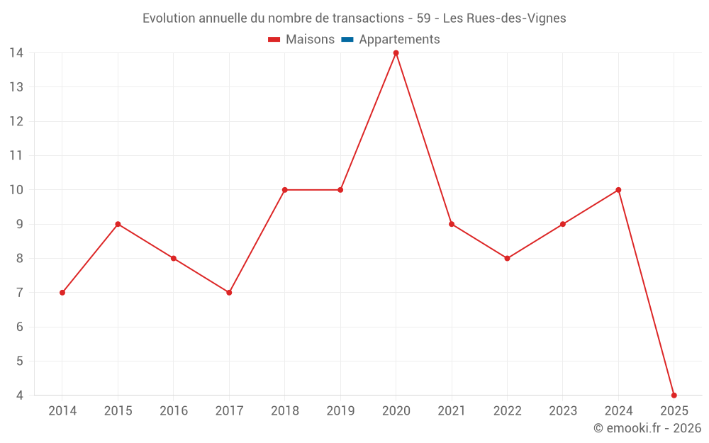 Le prix médian sur les 21 transactions de maisons des 24 derniers mois dans la commune des Rues-des-Vignes était de 1 404 € par mètre carré pour une valeur foncière médiane de 125 000 €. Sur cette période 60% des transactions se sont situées entre 708 et 1 835 € par mètre carré (du 2ème au 8ème déciles).