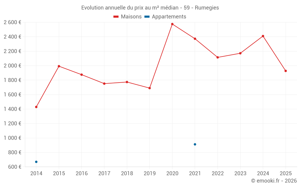Le prix médian sur les 32 transactions de maisons des 24 derniers mois dans la commune de Rumegies était de 2 229 € par mètre carré pour une valeur foncière médiane de 252 750 €. Sur cette période 60% des transactions se sont situées entre 1 889 et 2 571 € par mètre carré (du 2ème au 8ème déciles).
