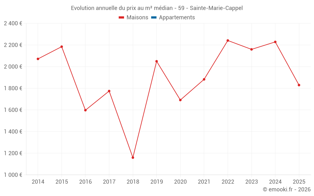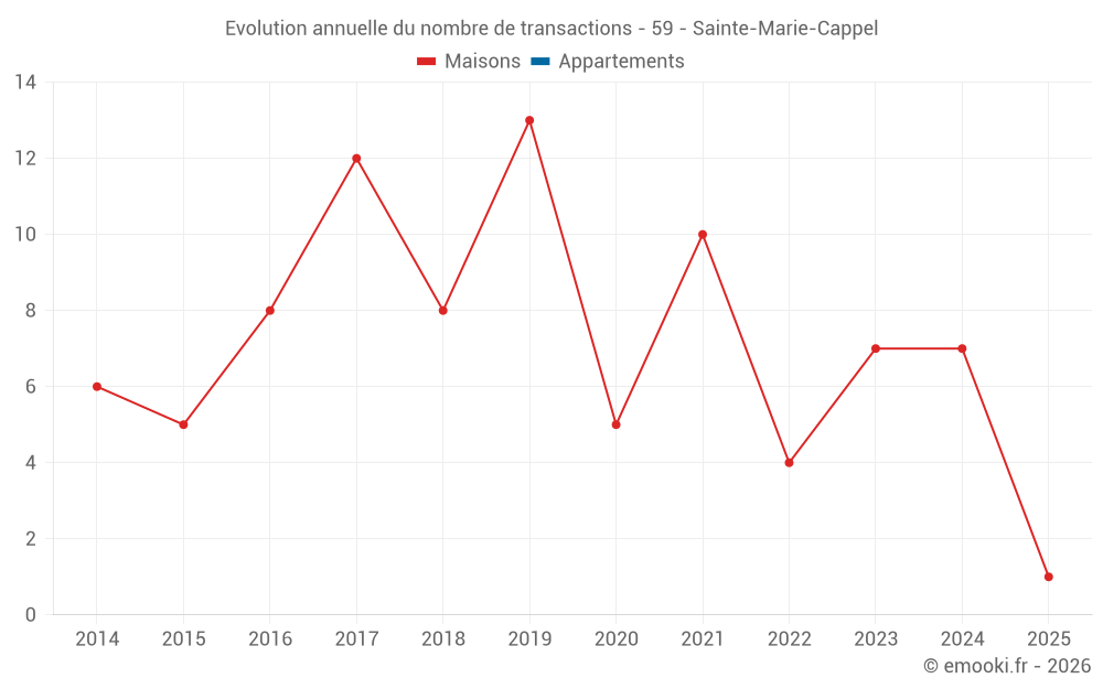 Le prix médian sur les 14 transactions de maisons des 24 derniers mois dans la commune de Sainte-Marie-Cappel était de 2 194 € par mètre carré pour une valeur foncière médiane de 278 250 €. Sur cette période 60% des transactions se sont situées entre 1 910 et 2 463 € par mètre carré (du 2ème au 8ème déciles).