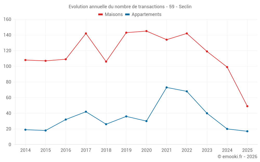 Le prix médian sur les 20 transactions de maisons des 3 derniers mois dans la commune de Seclin était de 2 750 € par mètre carré pour une valeur foncière médiane de 239 725 €. Sur cette période 60% des transactions se sont situées entre 2 143 et 3 196 € par mètre carré (du 2ème au 8ème déciles).